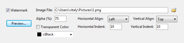 Also you can select Alpha blending (%) and transparent color of watermark image.